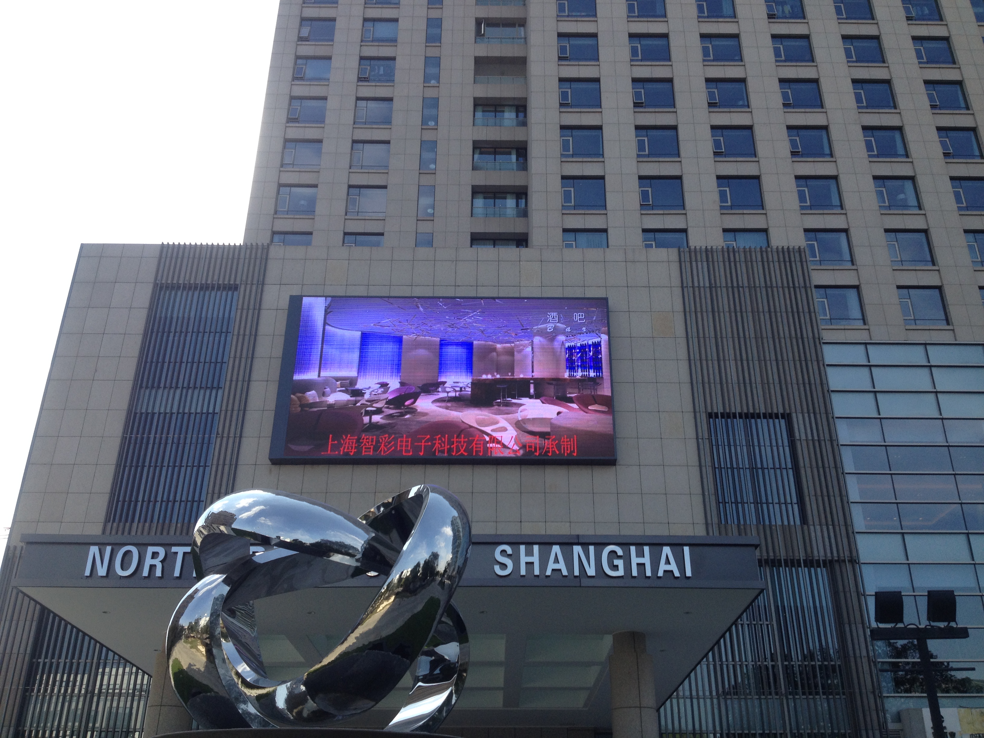 上海北上海國(guó)際大酒店會(huì)議室P8戶(hù)外全彩LED顯示屏由智彩科技承制。